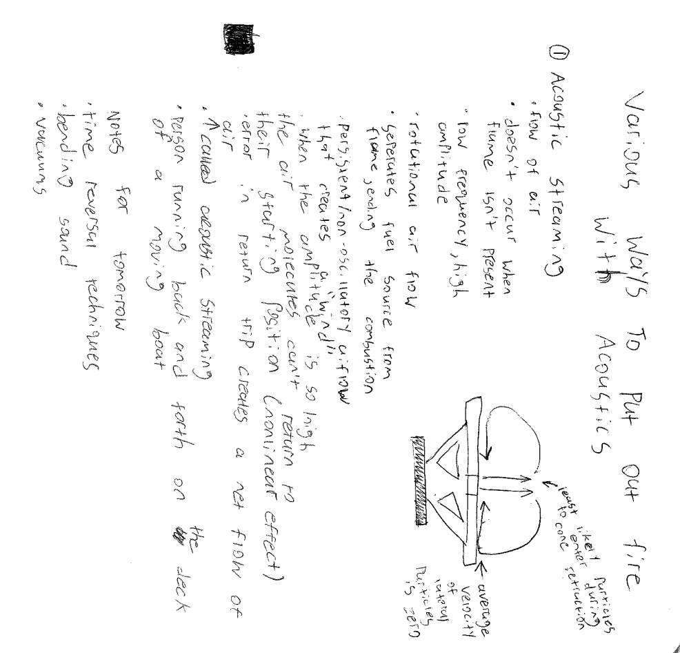 2/12: I’m fascinated with the idea of the time reversal technique to extinguish fire, it concentrates the sound in one area and I want to explore it more to see if I could possibly implement it into my own project. Furthermore I’m looking more deeply into the physics of how sound can put out fire including acoustic streaming and acoustic oxygen displacement.