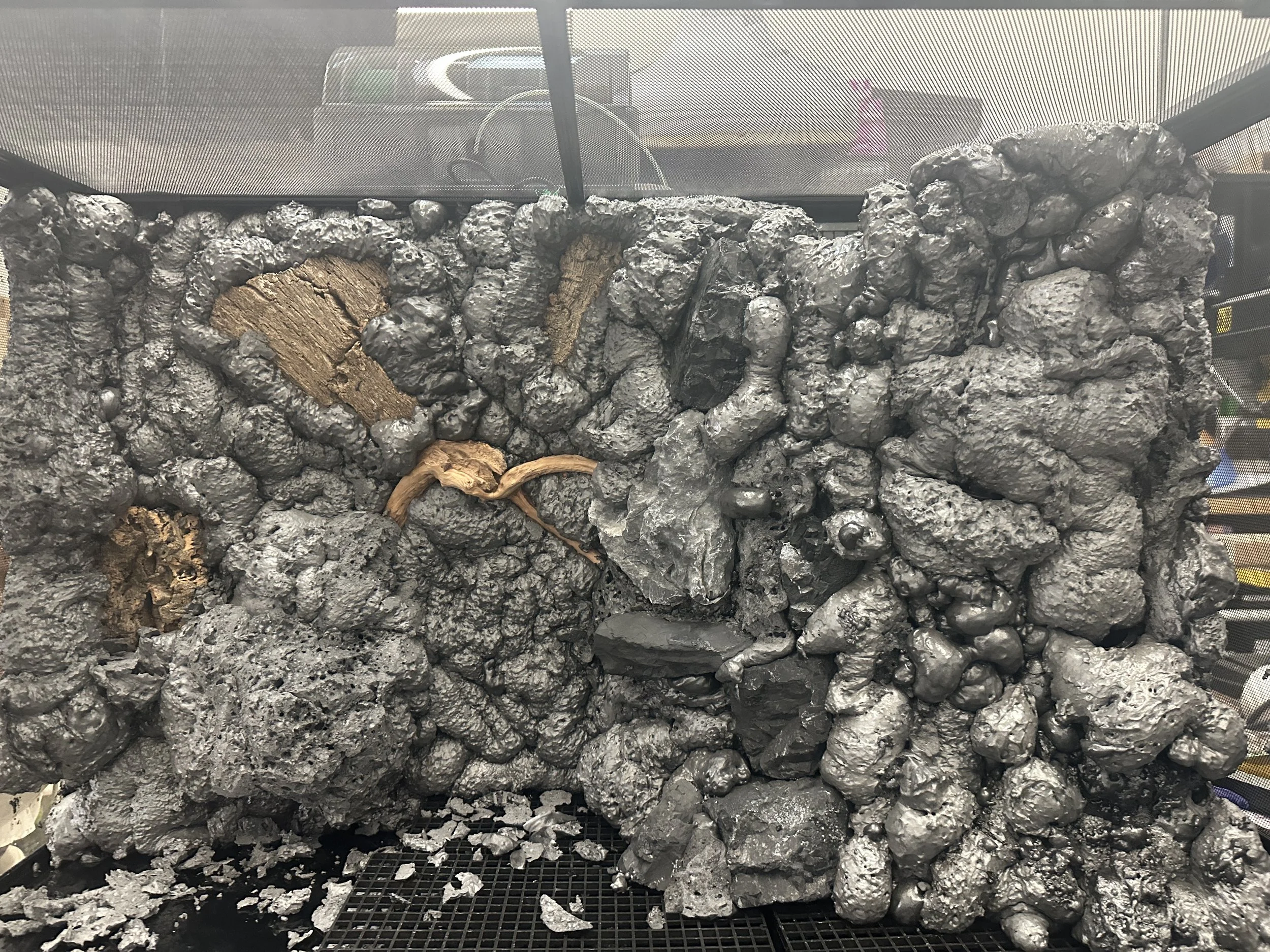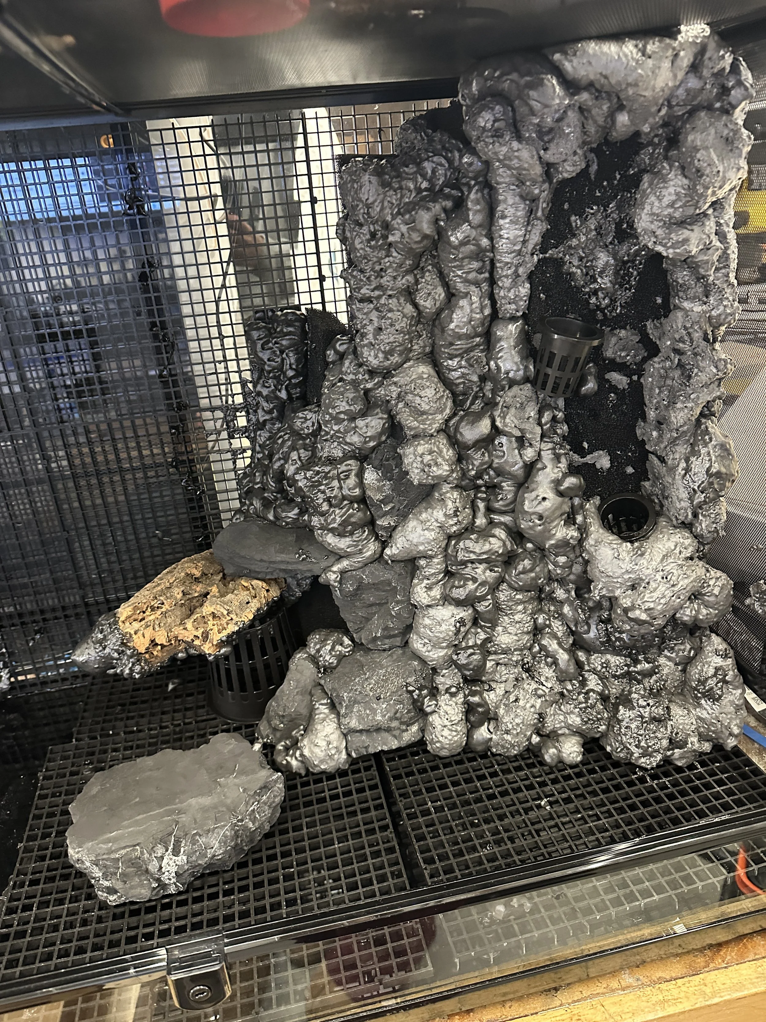 I started making the waterfall area using silicone and aquarium grid separators. I am going to add glass to the mesh side, and seal the grids with expanding foam.
