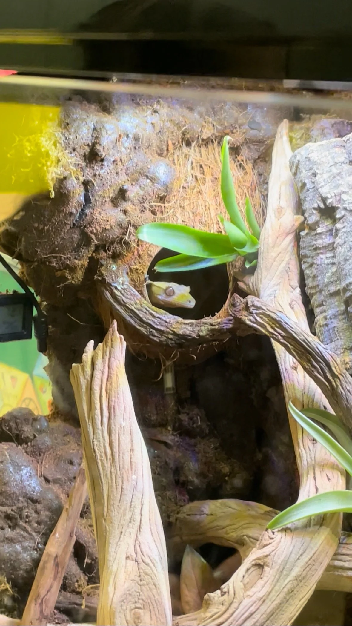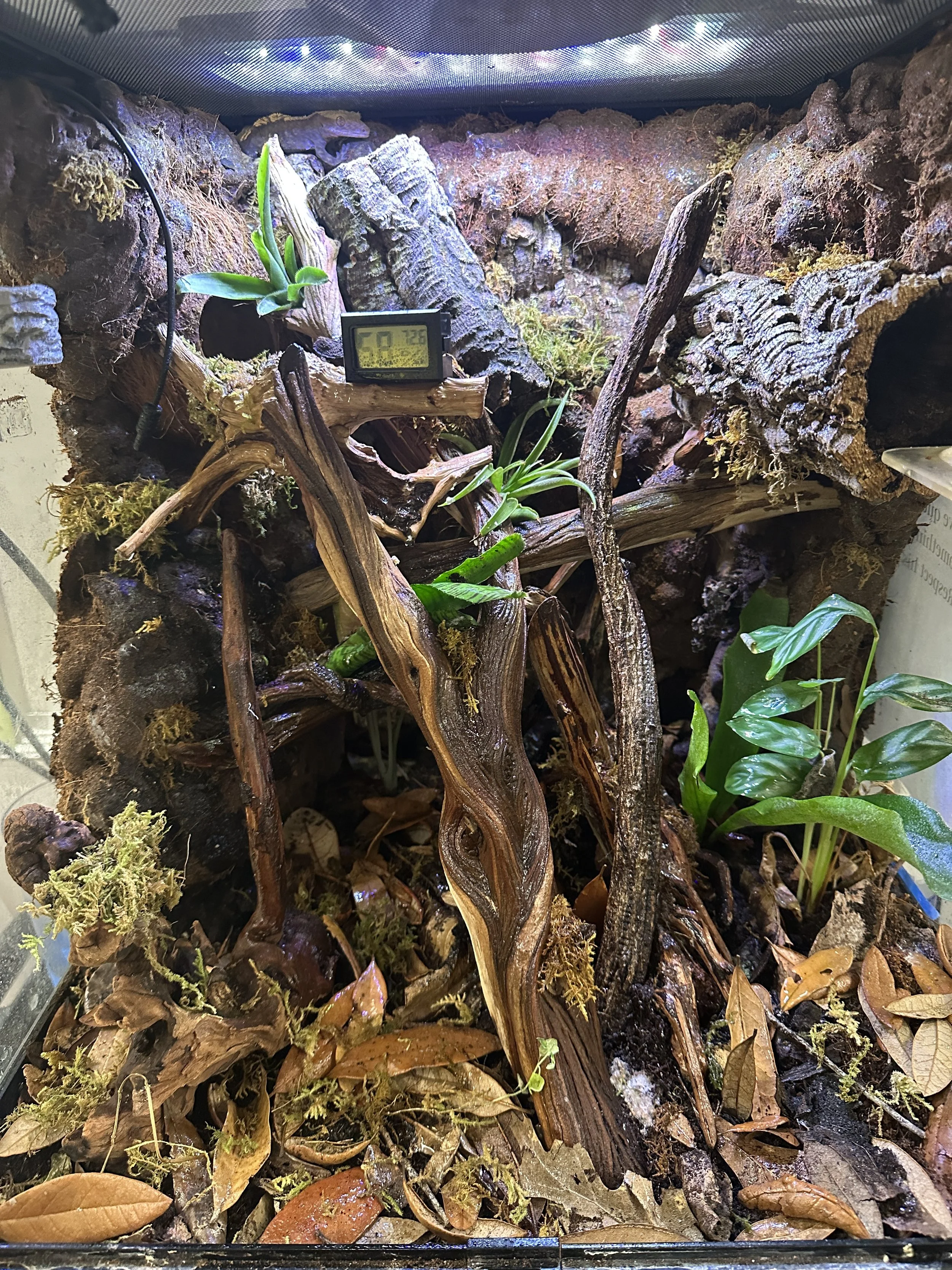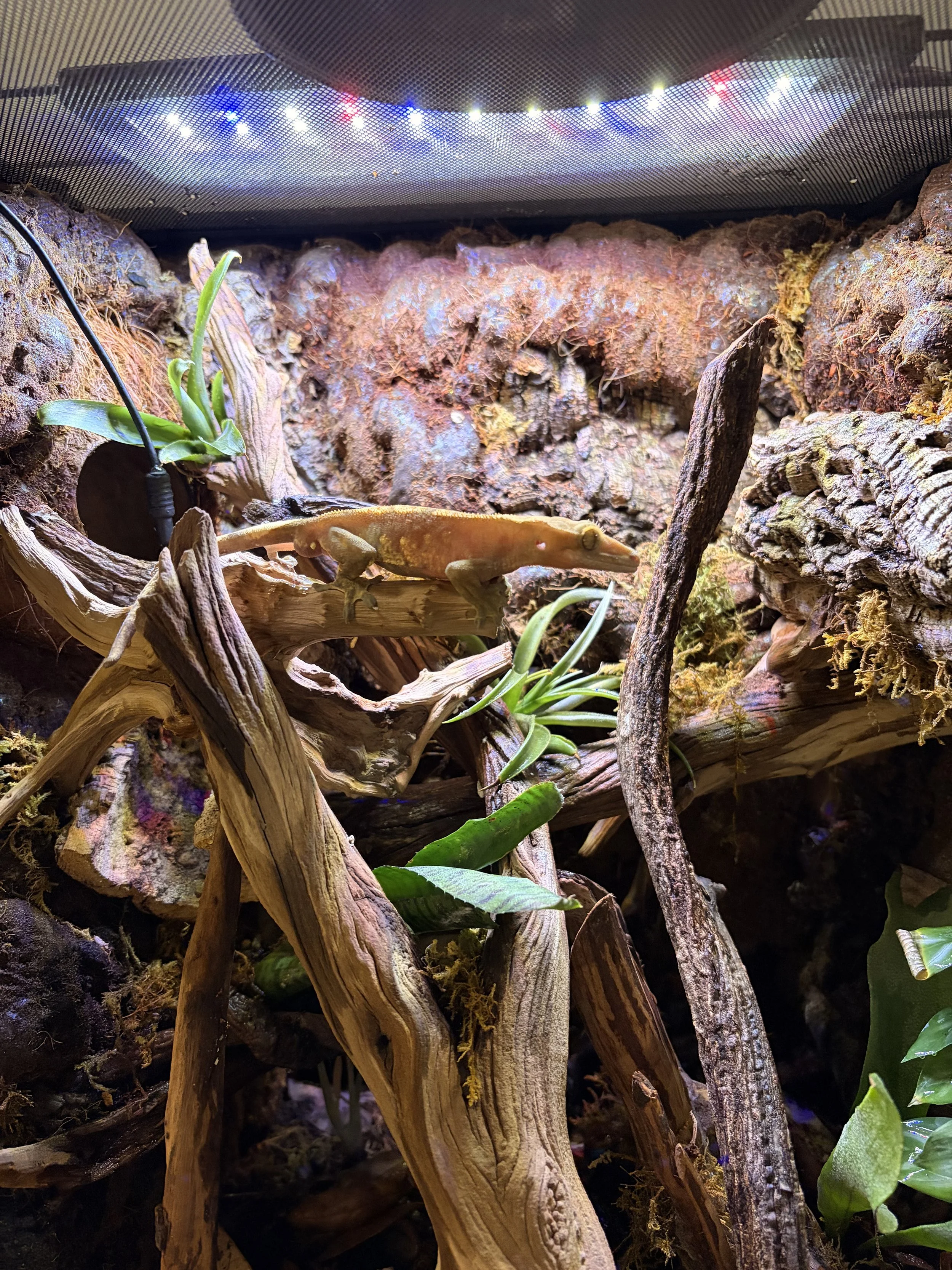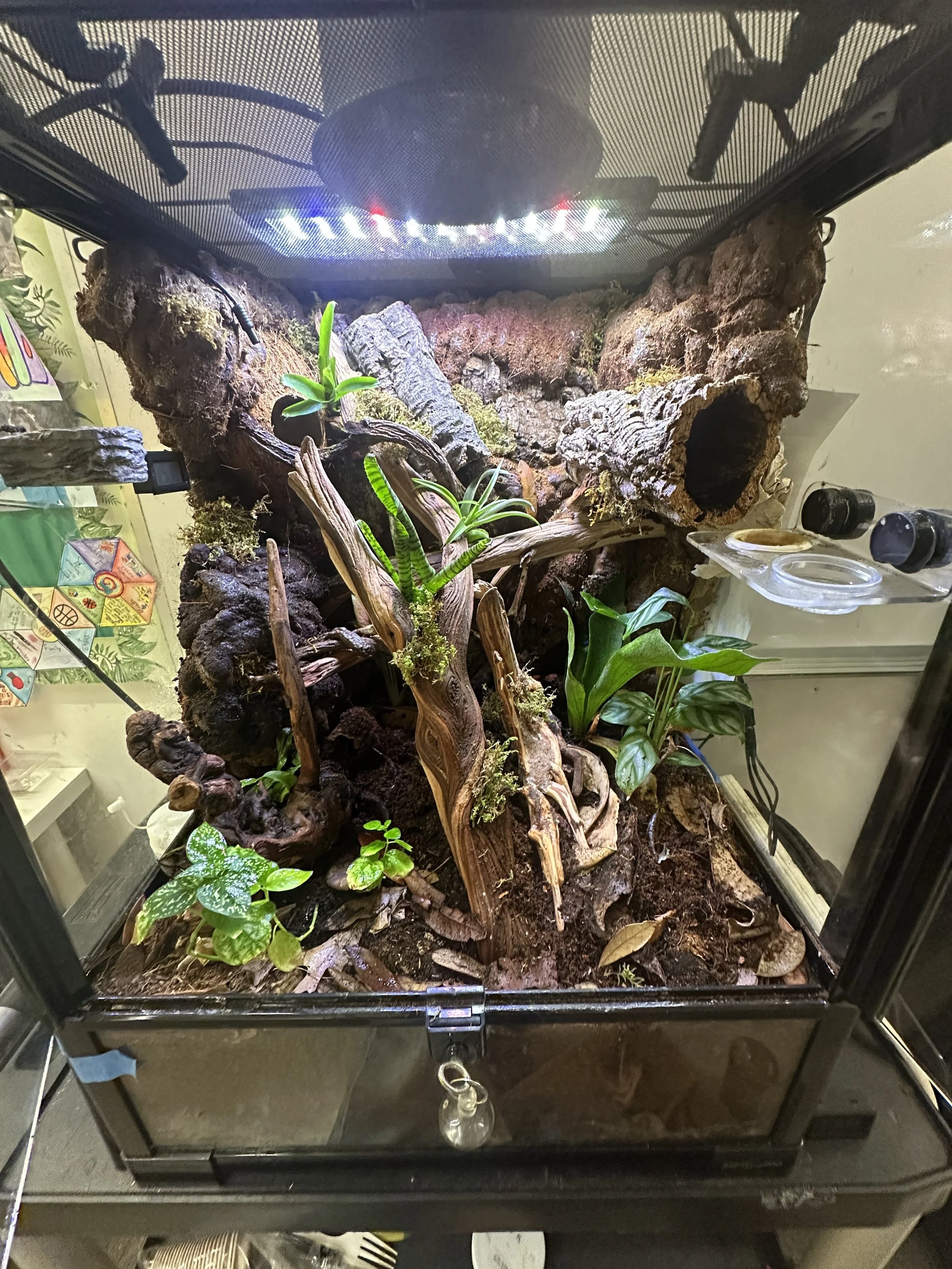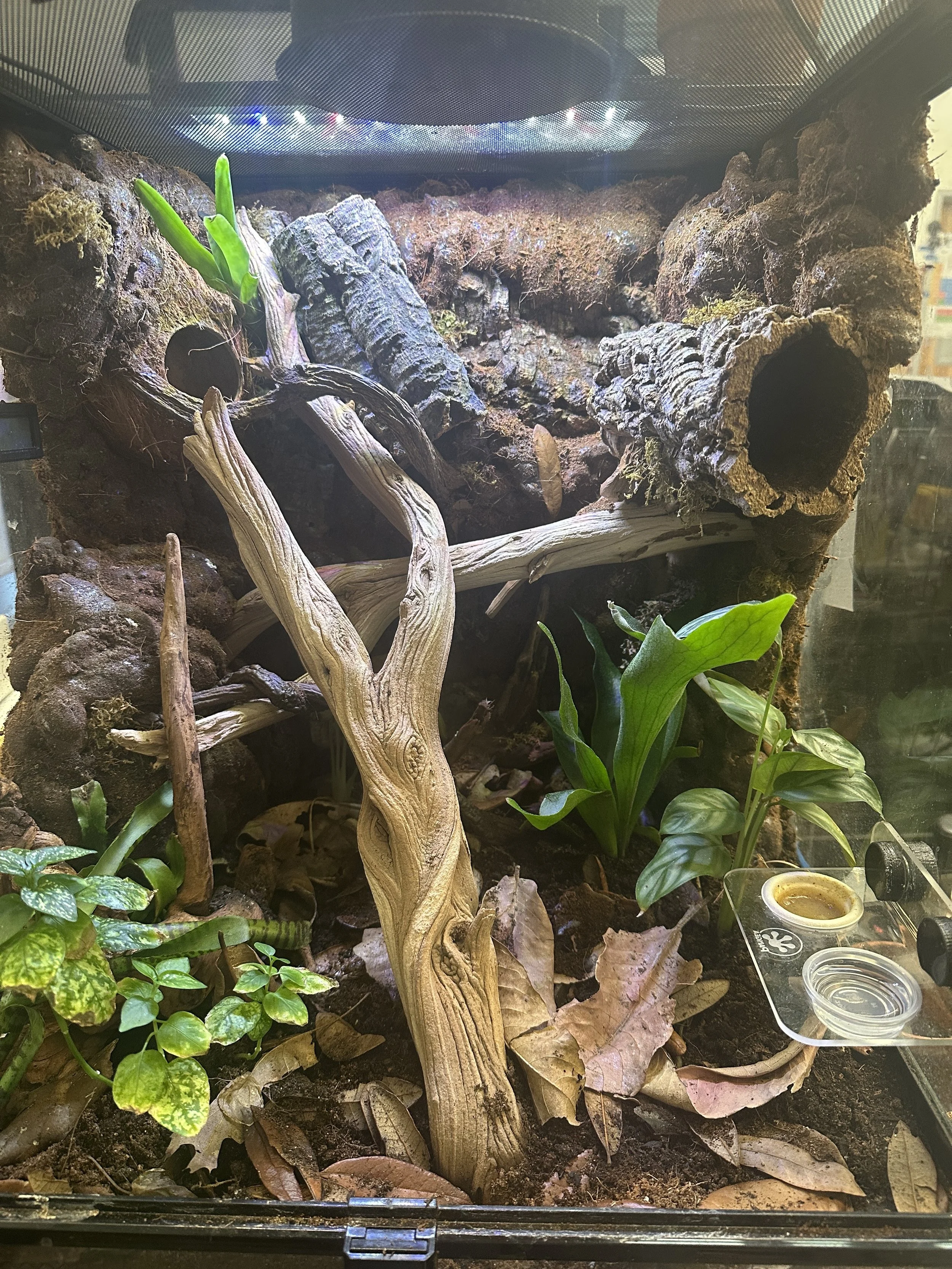 I added new wood to Pedro's terrarium. I don’t know what he does at night, but it provides more climbing stuff.