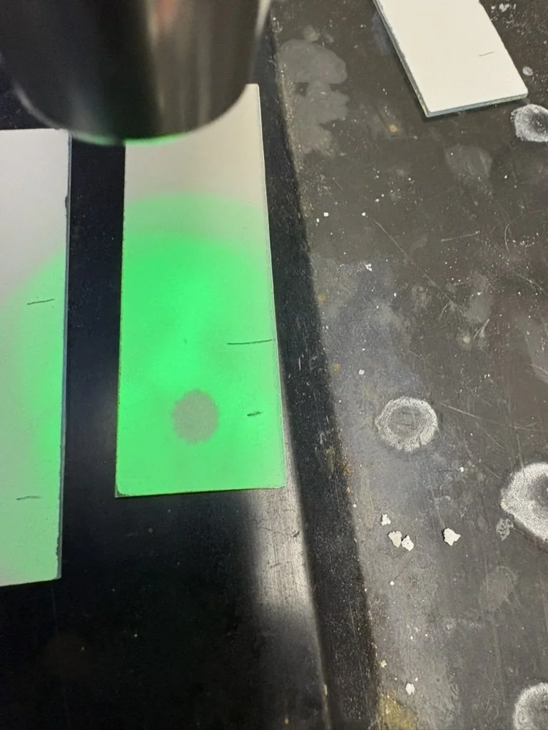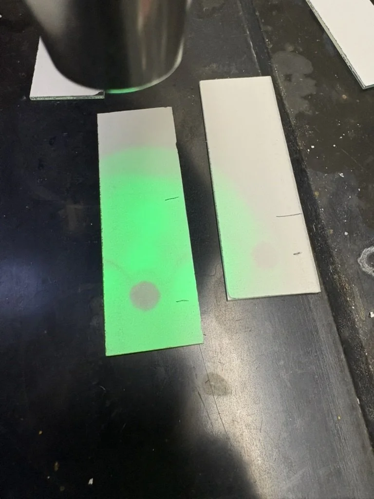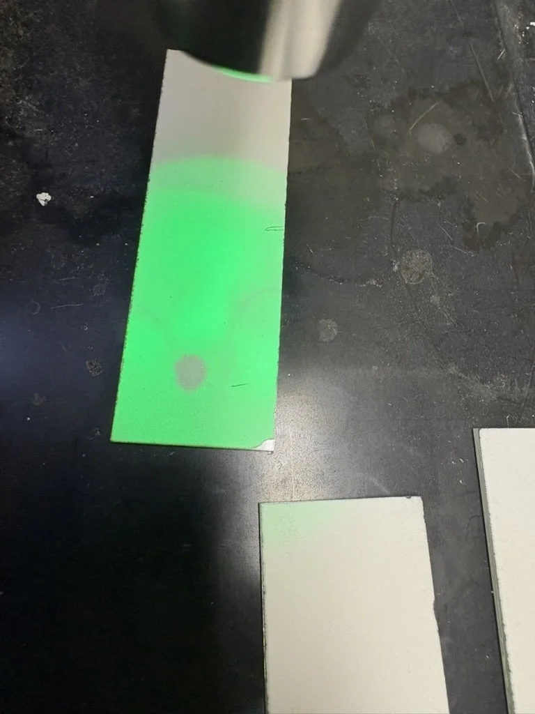 The successful results of thin-layer chromatography to separate ethyl-2-cyano-3-phenylacrylate from a 30:1 petroleum ether and ethyl acetate solution. The bottom mark on each plate is where the phenylacrylate drop began, and the top mark is the solvent line.